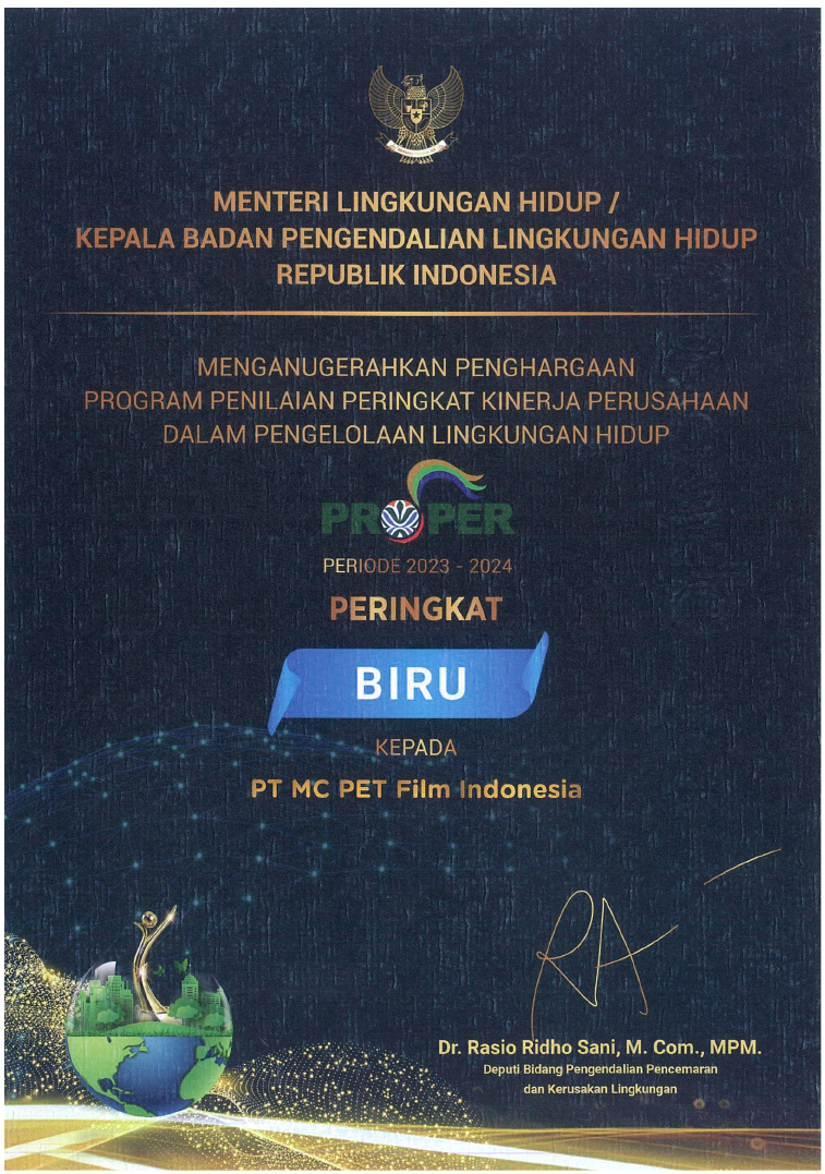 The Ministry of Environment and Forestry of the Republic of Indonesia awarded PT MC PET Film Indonesia with a PROPER certification in the PROPER program, which assesses the environmental performance of companies, with a BLUE rating. The PROPER certification is a recognition of PT MC PET Film Indonesia's commitment to environmental protection and comply to all Indonesian standard environmental regulations.